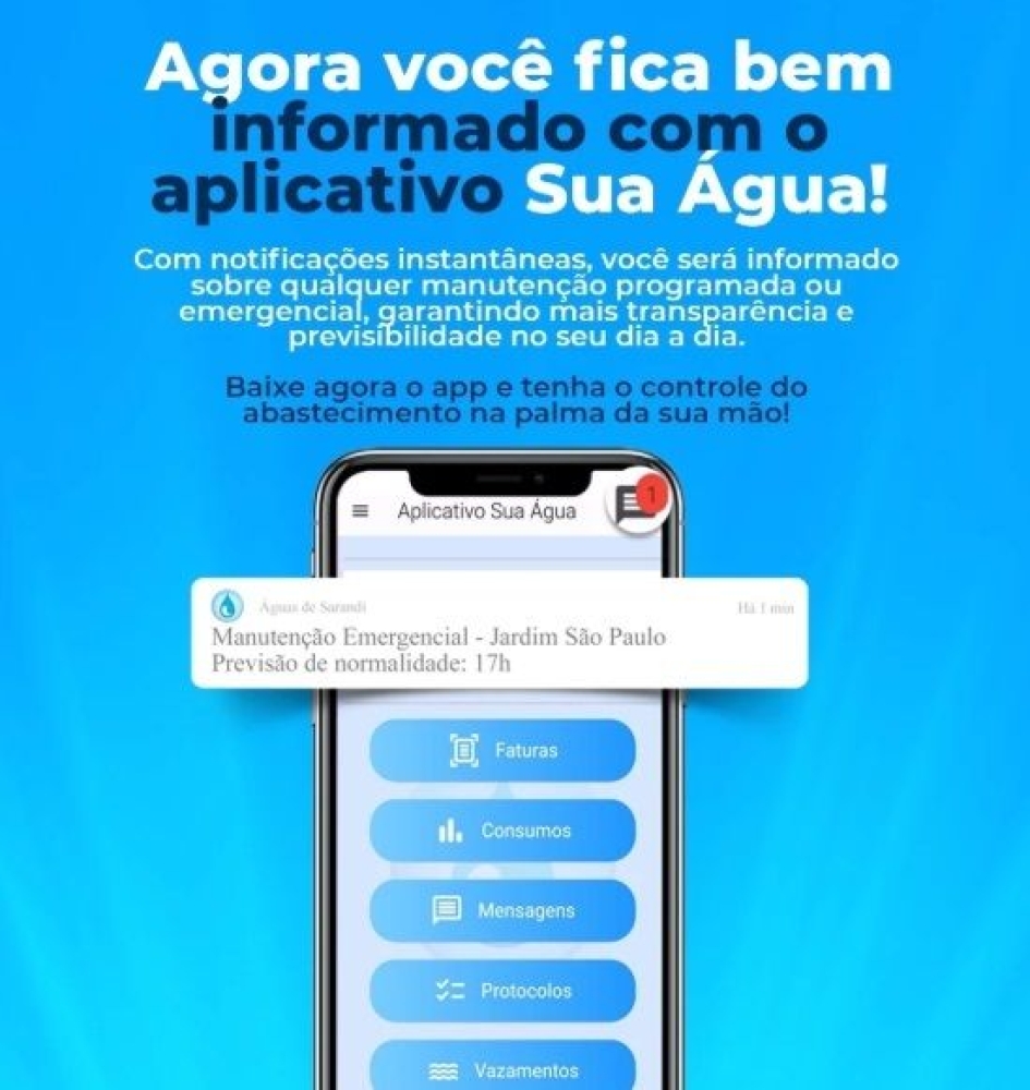 Com o aplicativo Sua Água, você recebe notificações em tempo real sobre manutenções, interrupções e atualizações importantes no abastecimento de água da sua região.